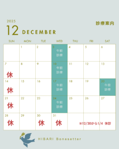 12月の診療案内です。 12月20日(土)は午前診療になります。 年末は30日から休診とさせていただきます。 ご不便をおかけしますがよろしくお願いいたします。