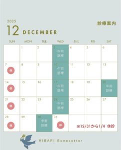 12月診療案内 2025-11-26 | コメントはまだありません | 未分類 12月の診療案内です。 12月20日(土)は午後診療になります。 ご不便をおかけしますがよろしくお願いいたします。 もっと読む »